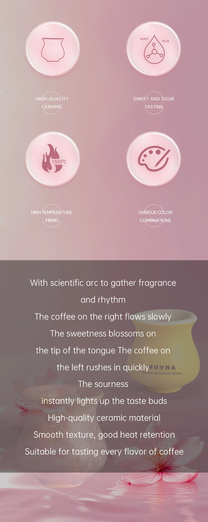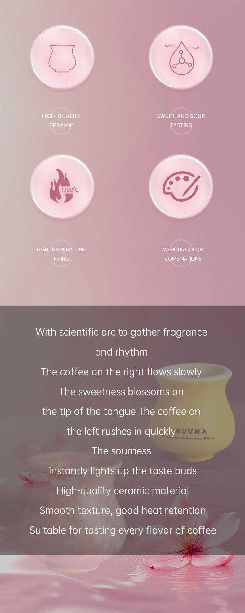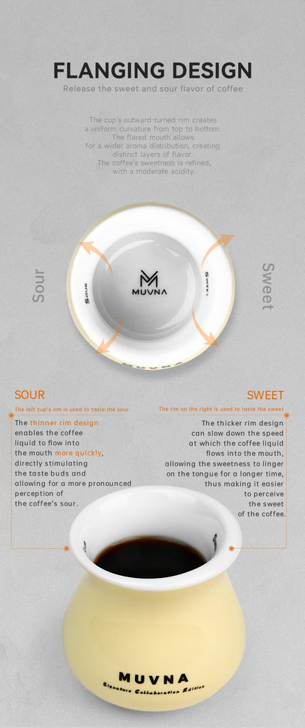 Left Side - Acidity Tasting Rim: The thinner rim allows coffee to flow into your mouth more rapidly, directly stimulating taste buds and making acidity more pronounced. This thin-rim design also delivers a cleaner finish, ideal for appreciating high-acidity coffee profiles.