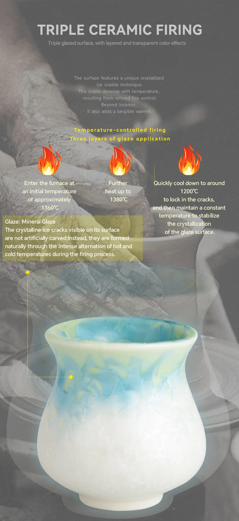 Triple Ceramic Firing:The crystalline ice cracks visible on its surface are not artificially carved;Instead, they are formed naturally through the intense alternation of hot and cold temperatures during the firing process.
